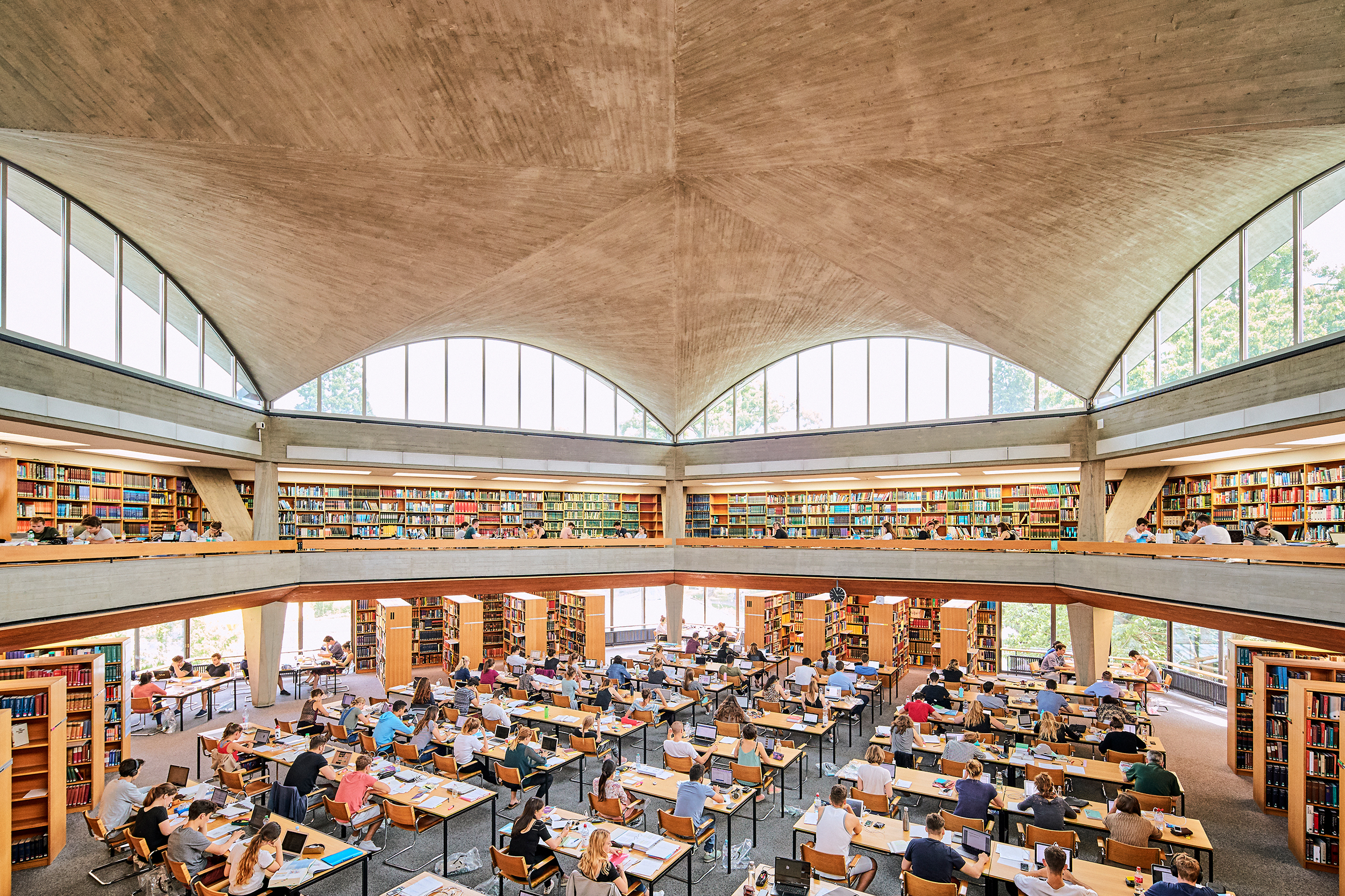 Der grosse Lesesaal der Universitätsbibliothek Basel wurde vom Architekten Otto Senn (1902–1993) in den Jahren 1962 bis 1968 entworfen. Er beeindruckt durch seine monumentale Betonschale, die vom Ingenieur Heinz Hossdorf (1925–2006) konstruiert wurde. Der als Halle konzipierte Lesesaal greift ein beliebtes Element der Bibliotheksarchitektur auf. Zugleich ist die Formsprache dem damals vorherrschenden Funktionalismus verschrieben, der Dekoration zugunsten von Technik und Zweckmässigkeit bewusst zurückstellte. Grosse Fensterfl ächen und die umlaufende Galerie schaffen helle, offene Lernräume und eine optische Verbindung zum Botanischen Garten. Der grosse Lesesaal gilt als ein architektonisches Glanzstück der Universität Basel.